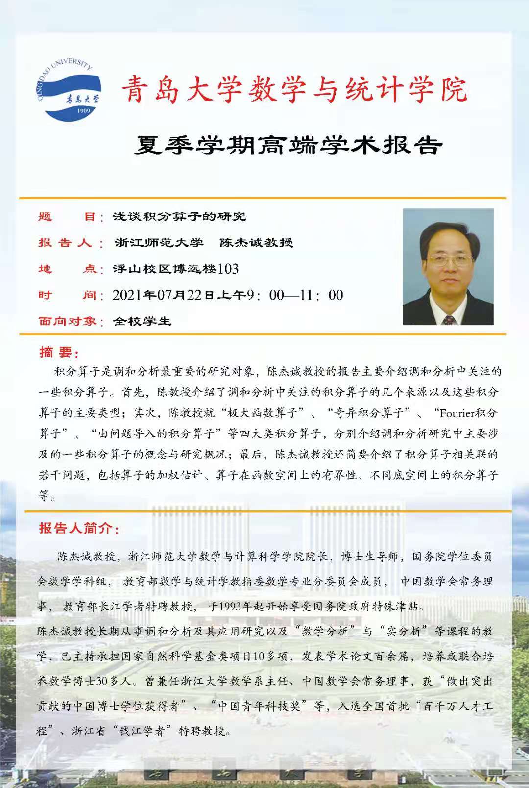 夏季学期第九场高端学术报告在国际学术交流中心崇德厅举行,来自浙江师范大学的教育部数学与统计学教指委数学专业分委员会委员陈杰诚教授为h动漫