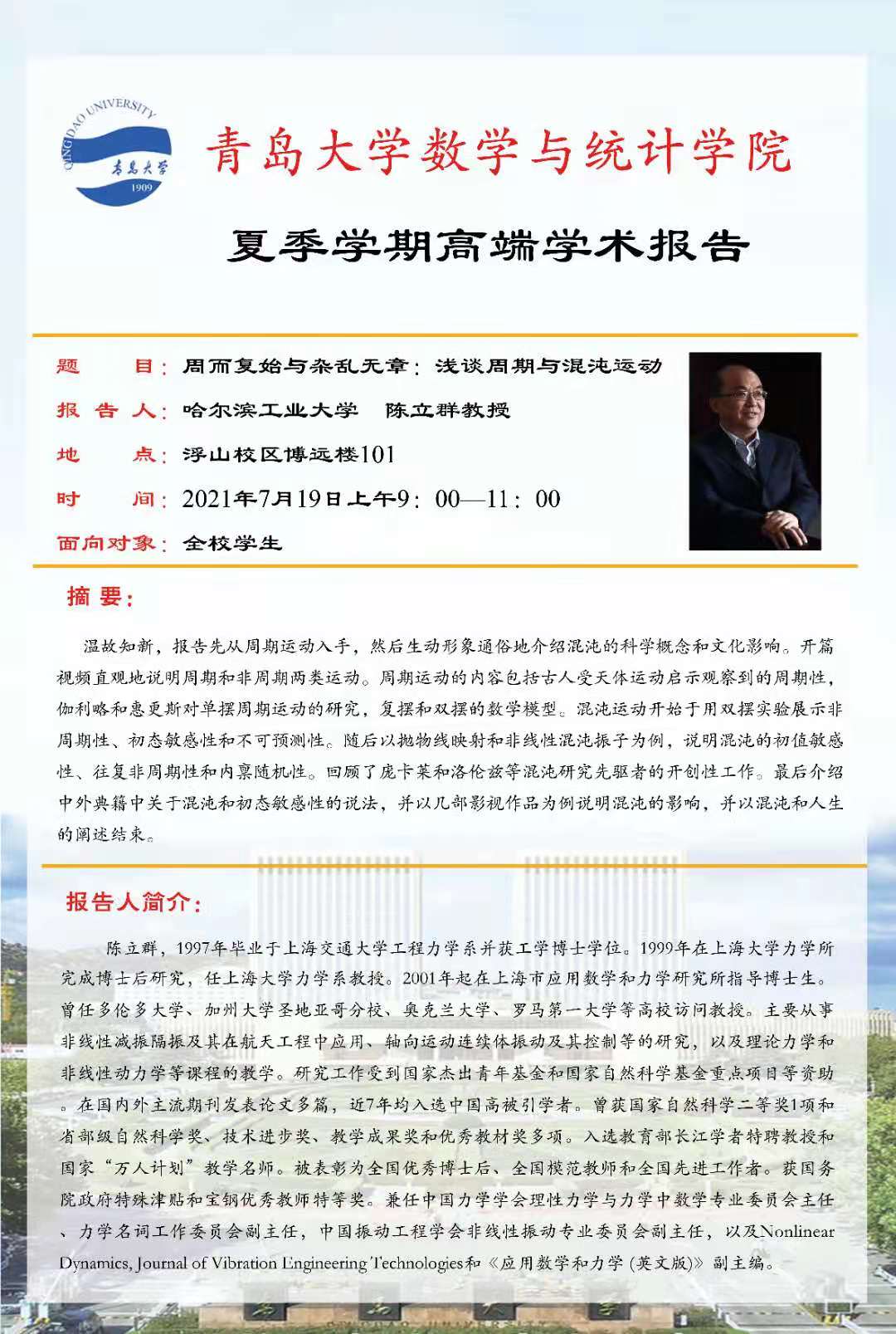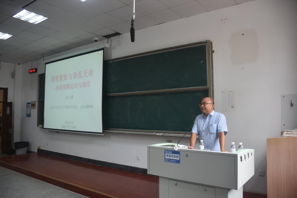 夏季学期第六场高端学术报告在博远楼101教室举行,来自哈尔滨工业大学的国家杰出青年科学基金获得者、教育部长江学者特聘教授、国家“万人计划”教学名师陈立群教授为全校师生作了“周而复始与杂乱无章:浅谈周期与混沌运动”的通识教育类高端学术报告,h动漫