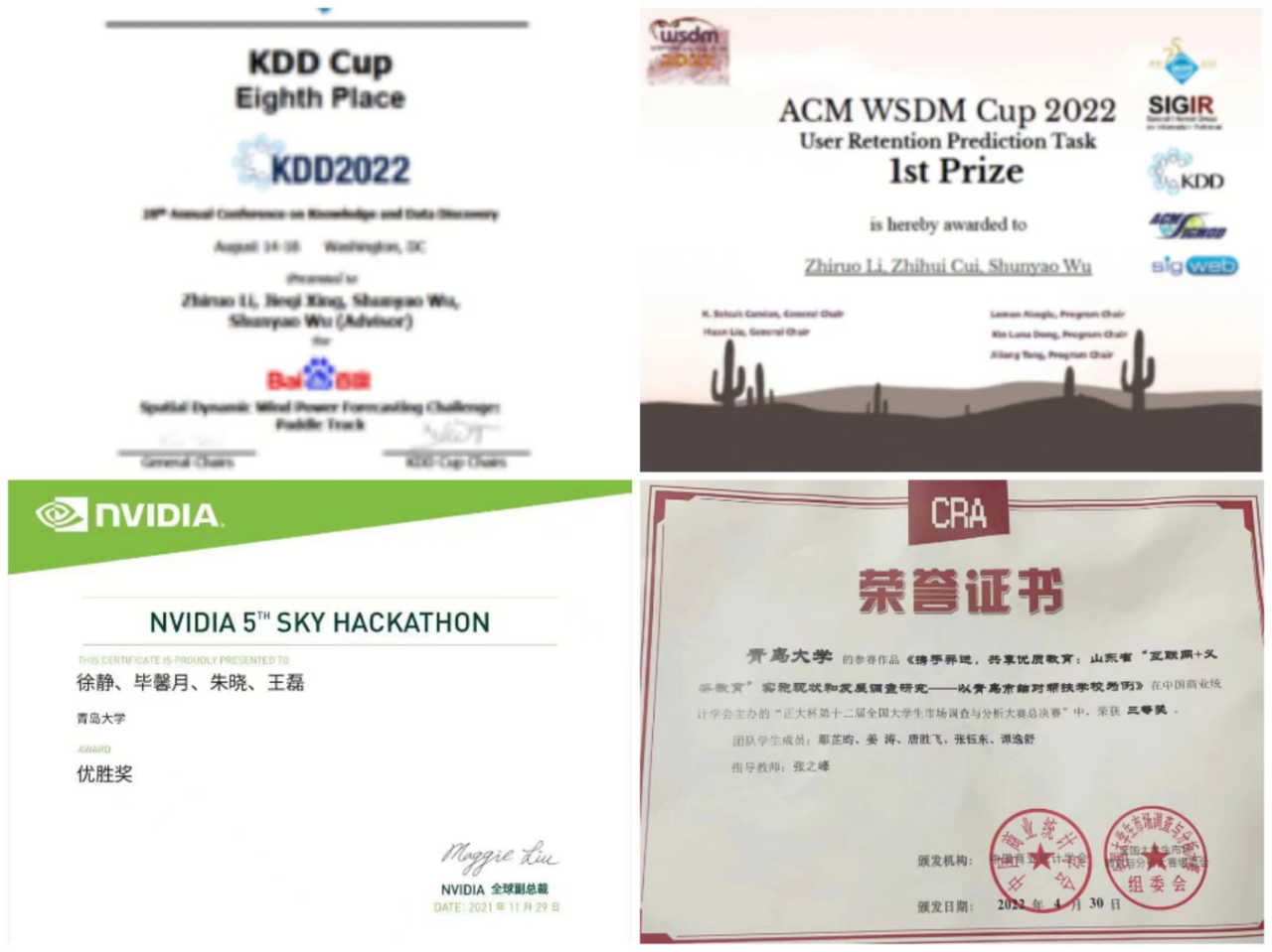 应用统计专业学位点围绕大数据分析方向,紧扣新时代研究生教育主线,以课程建设、学科竞赛为抓手,确立了“以课促练”、“以赛促学”的培养方针,着力推动研究生创新能力培养,提升研究生科研创新和实践创新能力。导师团队依托多元统计分析及案例、案例与论文写作、大数据分布式计算、非结构化数据分析、数据挖掘与机器学习等专业课程,改革教学模式,引领指导以赛促学。本专业学子在2022年的各项比赛中崭露头角,硕果累累,具体获奖奖项如下: