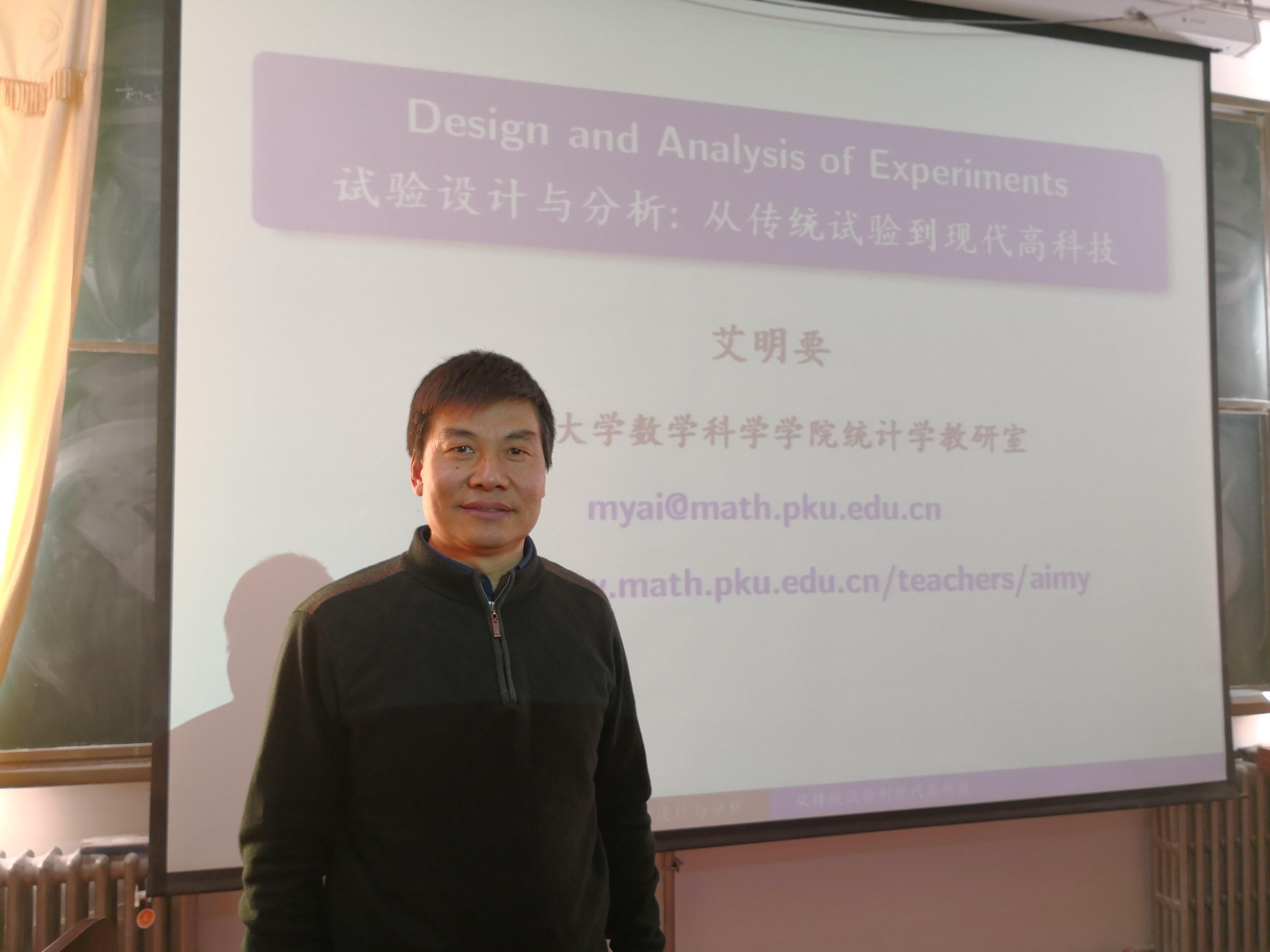 艾明要教授,博士生导师,现为北京大学数学科学学院统计学教研室主任,兼任中国现场统计研究会副秘书长、中国现场统计研究会试验设计分会理事长、高维数据统计分会副理事长、空间统计分会秘书长,是国际统计期刊《Statistica Sinica》、《Journal of Statistical Planning and Inference》、《Statistics and Probability Letters》、《STAT》(An electronic journal of ISI)的Associate Editor,国内数学期刊 《系统科学与数学》的编委。主要从事试验设计与分析、计算机试验、高维数据分析和应用统计的教学和研究工作,在Ann. Statist.、JASA、Biometrika、Technometrics、Statist. Sinica等国内外期刊发表学术论文六十余篇,主持或参与完成多项国家自然科学基金面上项目、重点项目和科技部973课题等。