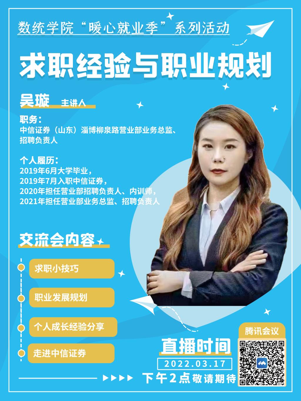 举办“暖心就业季”系列之“求职经验与职业规划”讲座。中信证券(山东)淄博柳泉路营业部HR吴璇总监主讲。学院党委副书记张雪蕾主持,h动漫