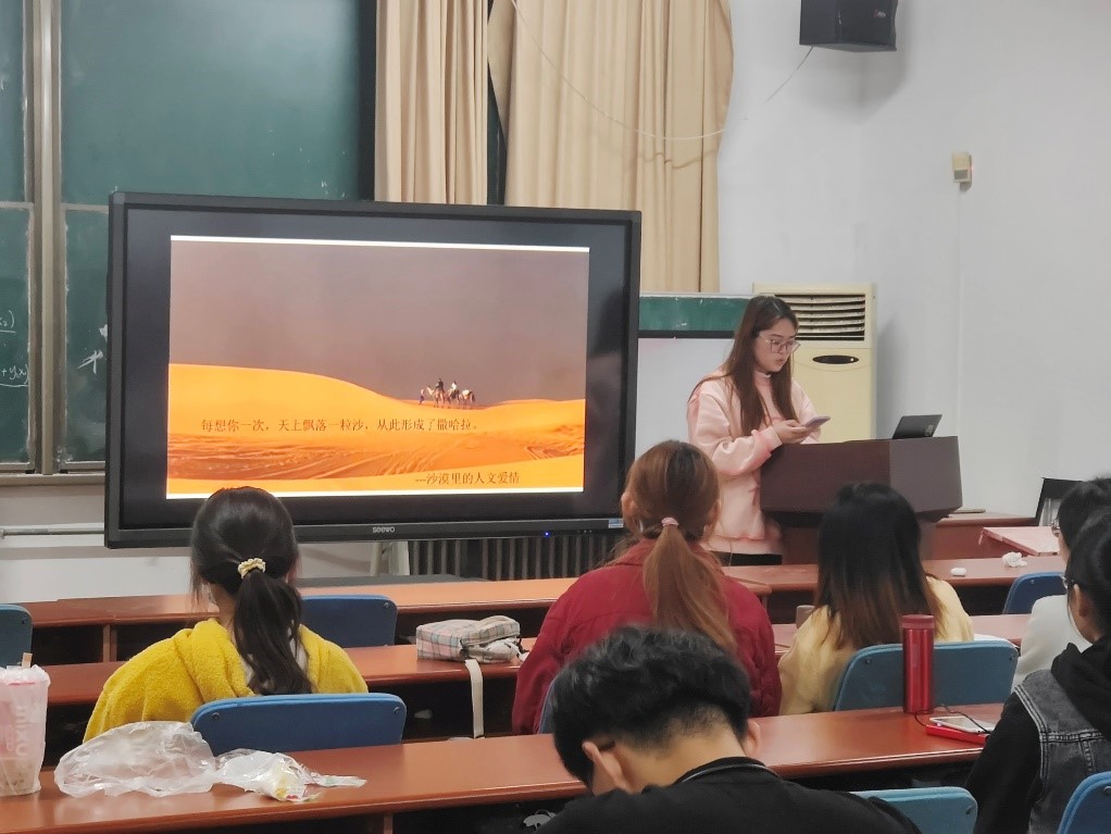 统计一班张载睿同学分享的是作家三毛的《撒哈拉的故事》。书中描写了三毛和荷西在撒哈拉沙漠生活时的所见所闻,以及与当地相识朋友的故事,每个故事都充溢着一种浪漫、浓情的异域情调,同时也透露出这个隐忍女子对生活的热爱和面对困难的坚定。