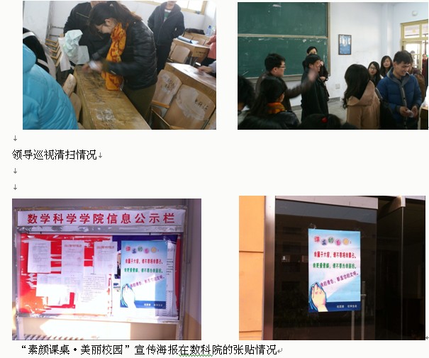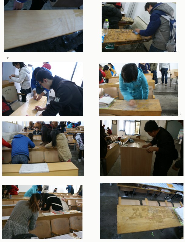 在校团委的领导下,数学科学学院学生会于2014年3月5日中午12点到13点对东二教1楼二合教室内桌椅的乱涂乱画占座现象的不文明现象进行了清理。