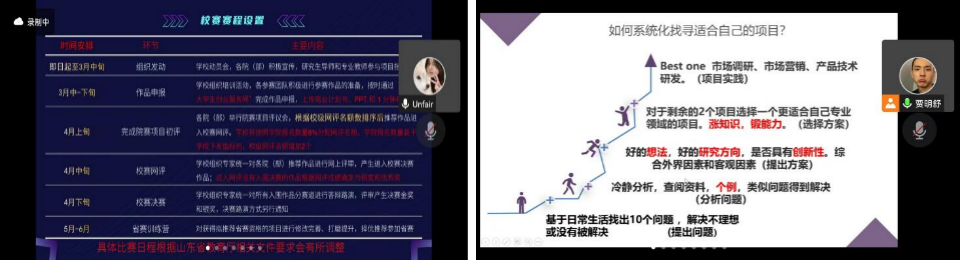 吕云鹤从大赛流程概述、比赛总结分析两方面对比赛政策进行解读,并以“红旅赛道”为例提出今年赛事设置的新特点,带领同学们从宏观层面了解互联网+;贾明舒进一步从如何系统化寻找合适项目、如何组建最优团队及注册公司注意事项分别进行解读,提出从社会痛点出发寻找项目的方法,鼓励同学们积极通过群聊等途径寻找志同道合的队友。