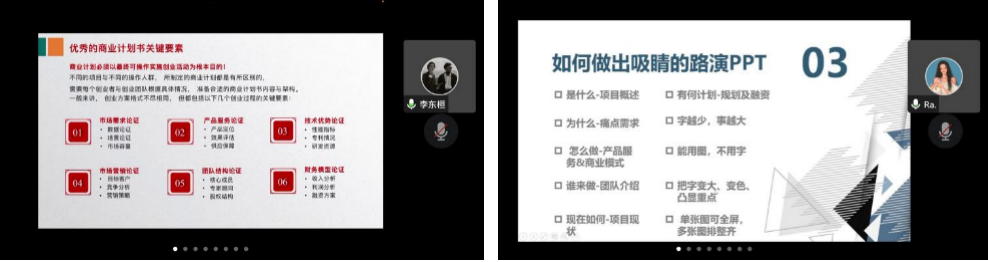李东桓侧重于解答商业计划书的相关问题。他详细列举了商业计划书封面、标题、正文的要点,并以“红旅赛道”为例总结优秀商业计划书的关键要素;崔雨瑞引领同学们聚焦大赛最终的路演环节,提出要想全面诠释本组项目,制作足够吸睛的PPT,要简洁明了、内容突出,表示方式尽量符号化、图形化,以便评委抓住项目要点。