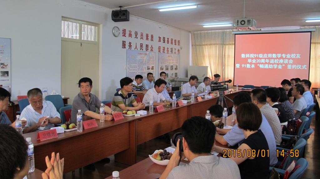 8月1日下午,数学科学学院在励行楼三楼会议室举办1991级应用数学专业校友毕业二十周年返校聚会及“畅通助学金”签约仪式。学院党委书记陈学文、院长高红伟、党委副书记张雪蕾、副院长赵凯、时任系领导老师代表苏孝业、田志远、张启春、校友办副主任郝伟及91级31名校友参加了座谈会。