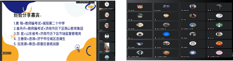 首先进行经验分享的,是考取教师编的黄旸和崔丹丹。黄旸就任于城阳第十二中学,她就初中教师编笔试展开经验分享,向同学们重点分享了复习时间安排并推荐了相关复习资料、网课;崔丹丹就任于济南市历下区燕山教育集团,就小学教师编面试问题展开分享,建议同学们在试讲时重视课堂真实性,面对考官时要展现自信大方的精神面貌。