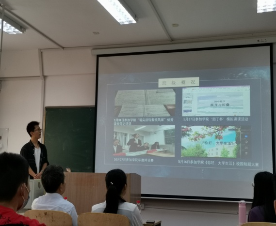 班会伊始,班长宋建飞以PPT的形式,分别从班级概况、宿舍概况和参赛获奖情况等方面介绍了班级同学大一学年的学习生活,学习委员林子华向杜书记展示了特色活动“班级小课堂”,汇报了同学们互帮互助共同学习的概况。随后播放了全班同学为感谢杜书记百忙之中参加班会而特意录制的小视频。